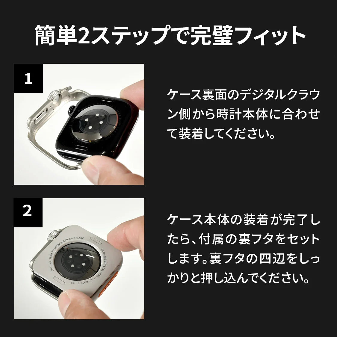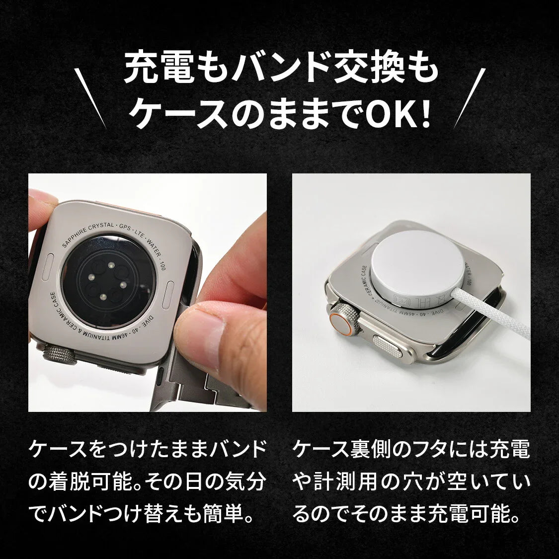 | 特徴 | ◆秒でAppleWatch Ultra風 ◆マットな質感で高級感たっぷり。細部のディティールまでこだわった高いクオリティのケースです。 ◆簡単ワンタッチでウルトラに。ケースをつけたまま充電・バンド交換も可能。 ◆本体にメタル、裏面にPC製のカバーで落下の衝撃や傷からアップルウォッチ本体を守ります。 |